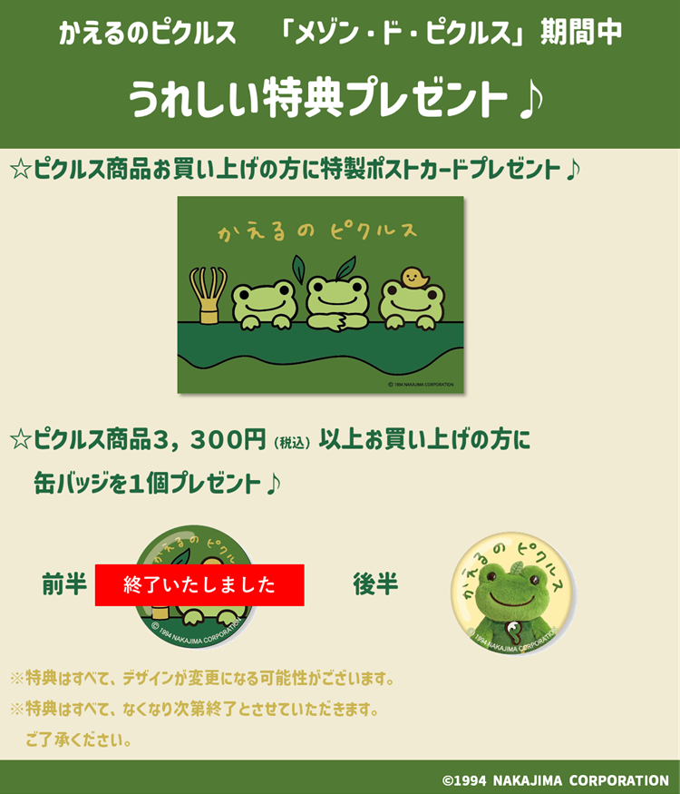 お買上げプレゼントの「缶バッジ」が予定数に達したため終了いたしました。