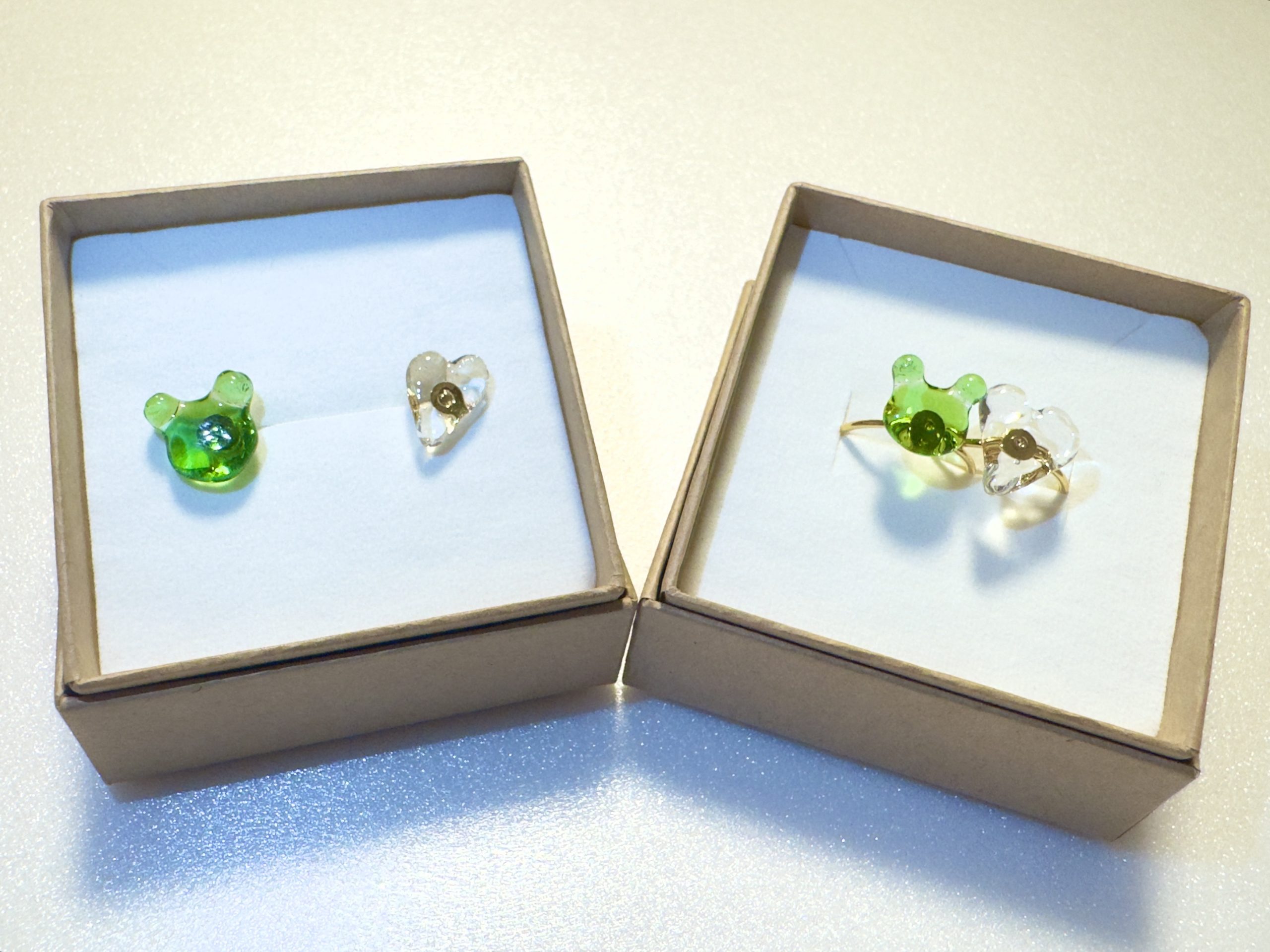 とろっとグリーンのピクルスフェイスとふわっと透明なハートとのセットで、リングとピアスに生まれ変わりました✨