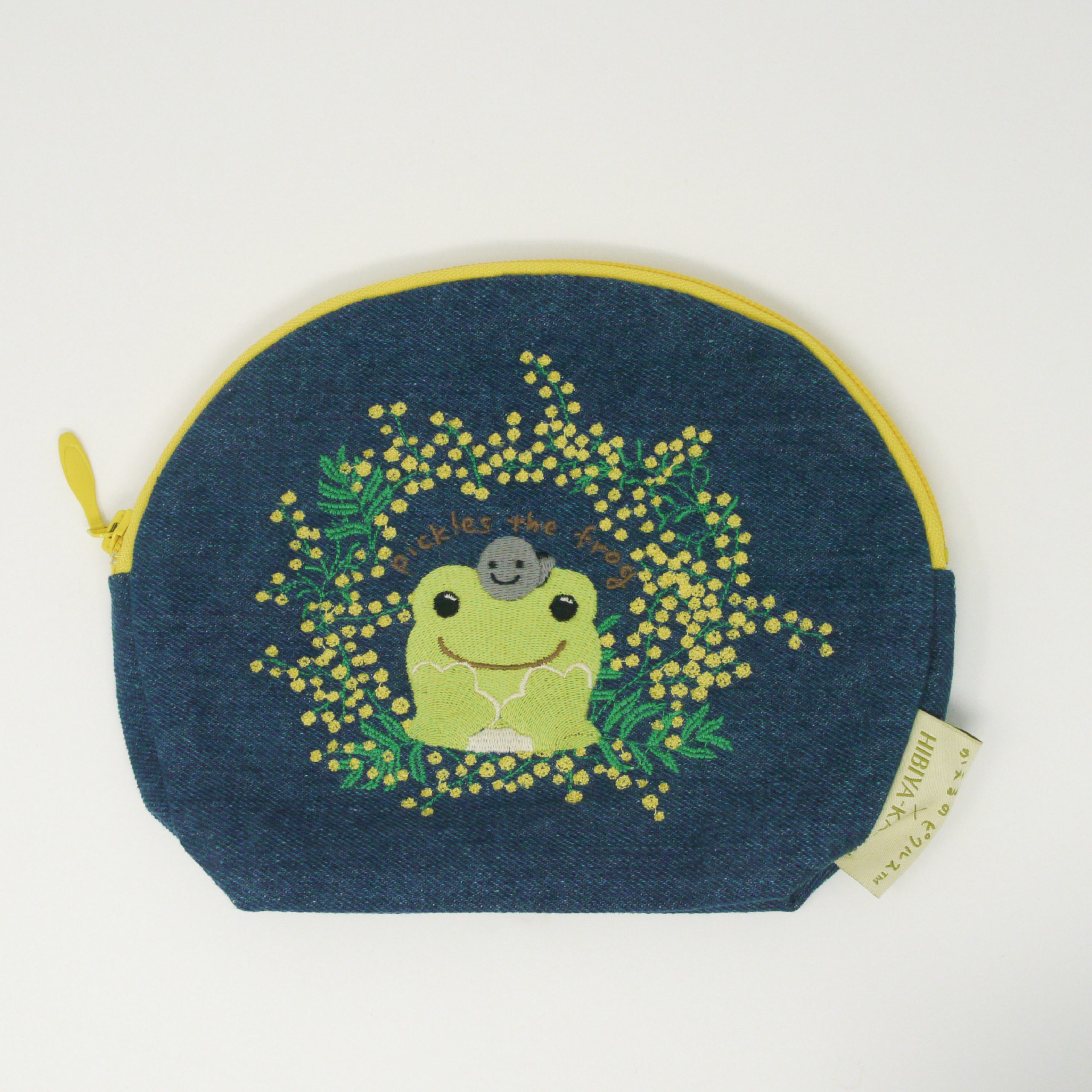 ミモザに囲まれて微笑むピクルスの刺繍が施されています。