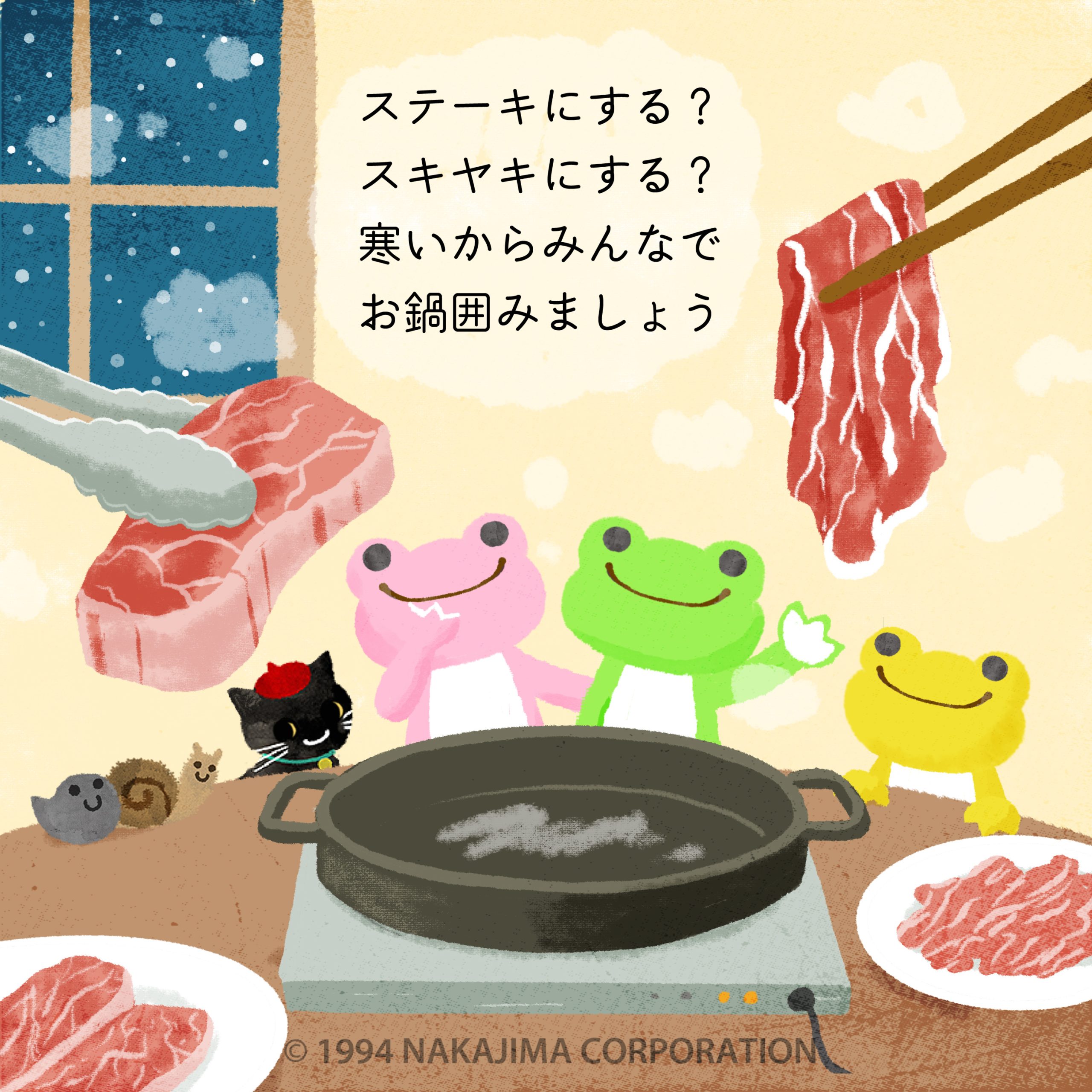 ステーキにする? スキヤキにする? 寒いからみんなで お鍋囲みましょう #かえるのピクルス #picklesthefrog #oneday #2月 #萌蛙匹克 #泡菜青蛙 #肉の日 #肉 #鍋 #平岡淳子 #吉井みい #ある日のピクルス